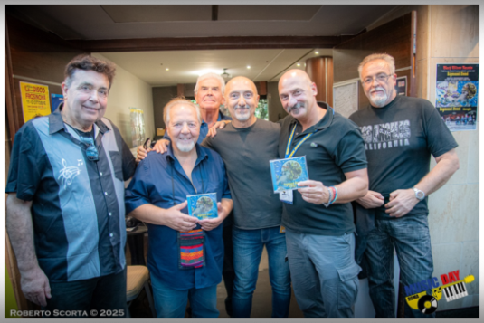 Nella foto la band con Francesco Pozone, patron del Music Day e Pino Pintabona della Black Widow Records - Italy